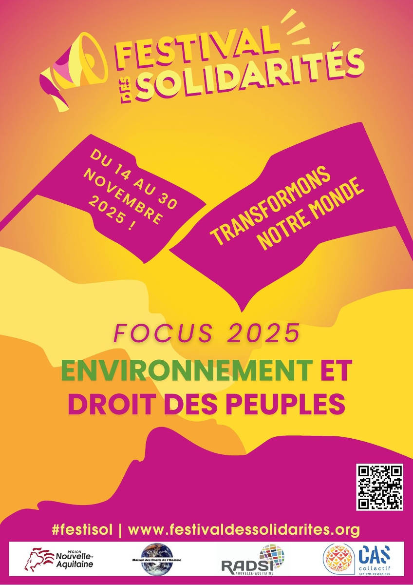 L’édition 2025 du « Festisol en Nouvelle-Aquitaine », le festival des Solidarités national décliné régionalement, aura lieu du 14 au 30 novembre 2025 sur l’ensemble du territoire au travers d’évènements locaux.